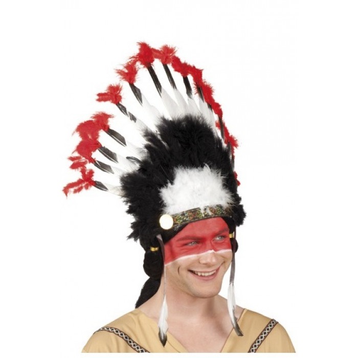 Индианска диадема с черни, бели и червенни пера. Подходящ аксесоар за парти и карнавал.
