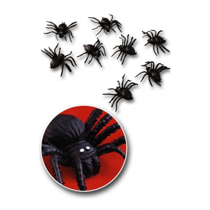 Комплект Паяци на ластик, осем броя в опаковка с диаметър на паяка 7 см. Подходящи за декорации за Хелоуин.