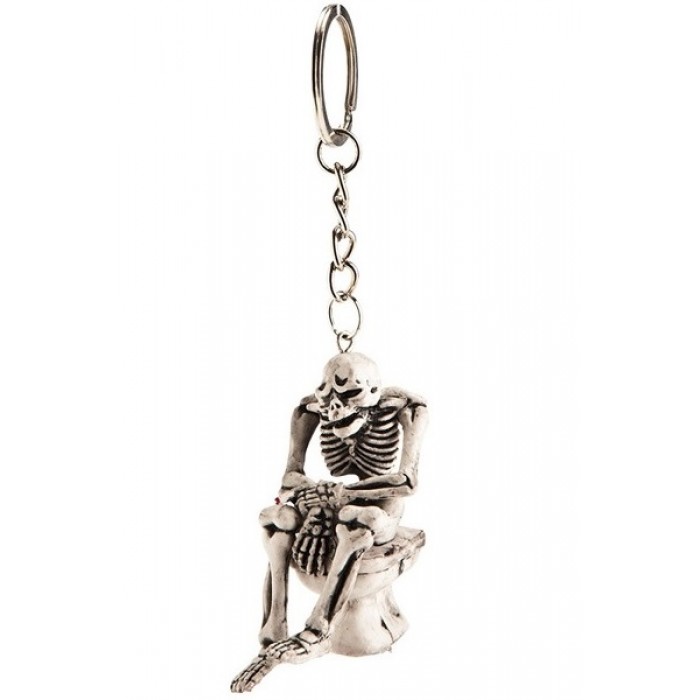 Ключодържател Скелет, седящ върху тоалетна чиния е изработен от пластмаса и метал. Подходящ за декорация за Хелоуин.