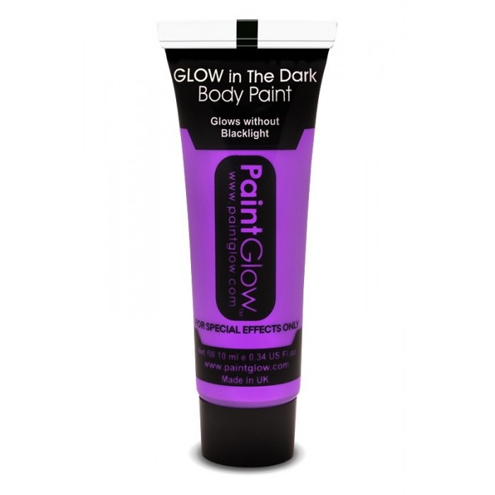 Фосфоресциращ грим за лице и тяло, светещ на тъмно, 10мл. Предлага се в лилав цвят. Подходящ е за Хелоуин, Коледа, Нова Година, маскарад, училищни празненства, парти, бал с маски и забави.