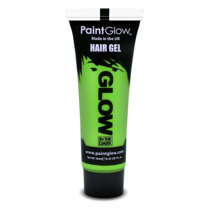 Фосфоресциращ гел за коса, 10 мл, светещ в тъмното. Предлага се в зелен цвят. Подходящ за оцветяване на коса или перуки за парти и карнавал.