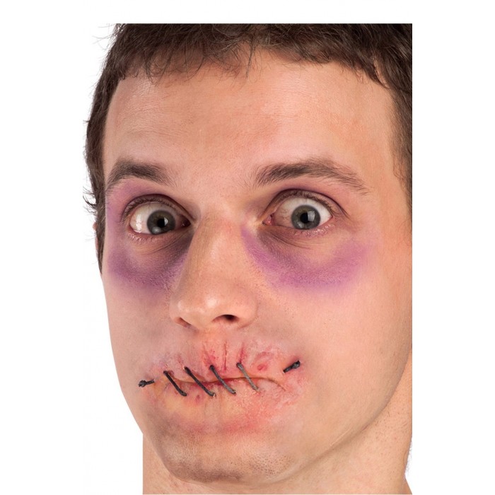 Релефна латексова татуировка с течно лепило, имитираща зашита уста. Особено ефектен и бърз начин да се включите в празнуването на Хелоуин.Начин на употреба:1. Разнесете лепилото върху латексовата татуировка.2. Поставете татуировката на желаното от вас място (върху чиста и суха кожа) и притиснете плътно.3. За по-добър ефект се снабдете с грим, който да приложите около и върху татуировка.
