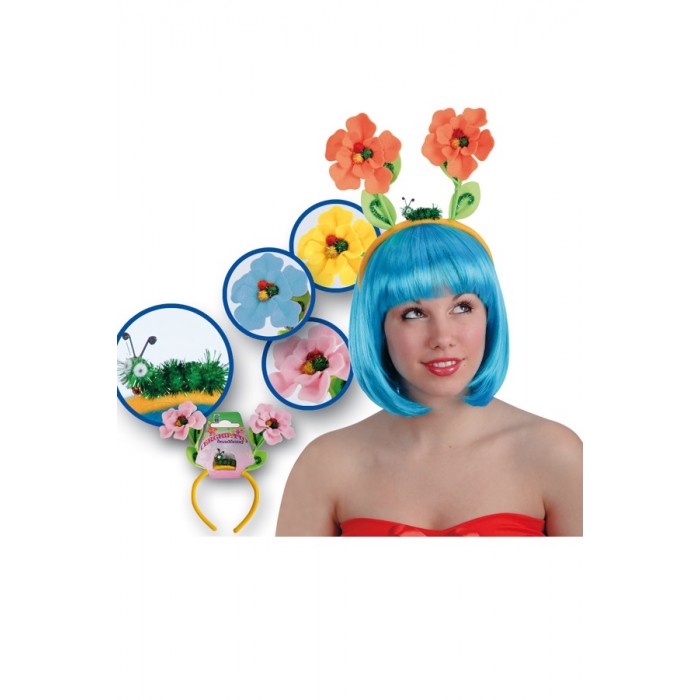 Диадема с цветя и зелена гъсеничка е изработена от плат. Предлага се със сини, жълти, розови и оранжеви цветя. Подходящ аксесоар за парти, карнавал, училищни празненства и всякакви забавления.