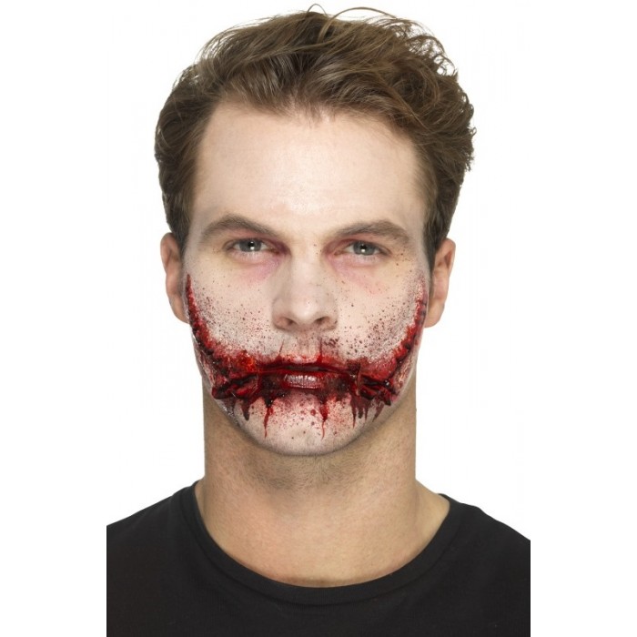 Релефна латексова татуировка с 2 пликчета х 1.5 мл течно лепило, имитираща зашита усмивка. Особено ефектен и бърз начин да се включите в празнуването на Хелоуин.Начин на употреба:1. Разнесете лепилото върху латексовите татуировки.2. Поставете татуировката на желаното от вас място (върху чиста и суха кожа) и притиснете плътно.3. За по-добър ефект се снабдете с грим и изкуствена кръв, които да приложите около и върху татуировката.