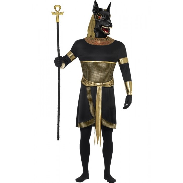Мъжки костюм Анубис се състои маска (изработена от латекс), черна туника с яка, ленти за ръцете и колан, изработени от плат. Подходящ за Хелоуин, парти, карнавал, училищни празненства и забави. Предлага се в размер L.