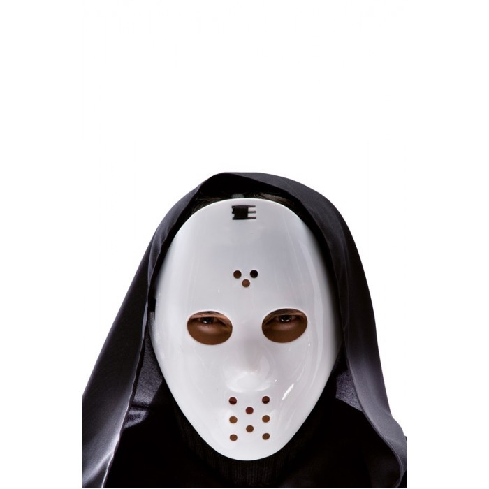 Хокейна маска, бяла. Изработена е от твърда пластмаса. Качулката не е включена. Подходяща за парти, карнавал, забавления.