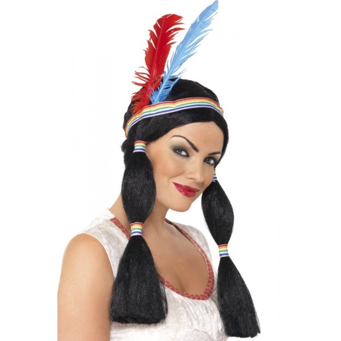 Перука Индианка с лента и пера е изработена от изкуствен косъм. Подходяща за парти, карнавал и всякакви забавления.