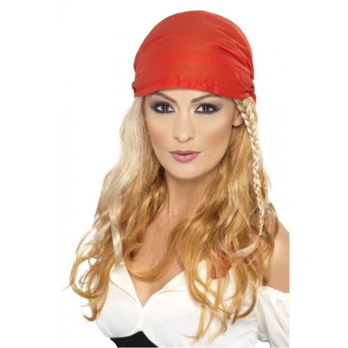 Перука Пират с червена кърпа, руса е изработена от изкуствен косъм и плат. Подходяща за Хелоуин, парти, карнавал и всякакви забавления.