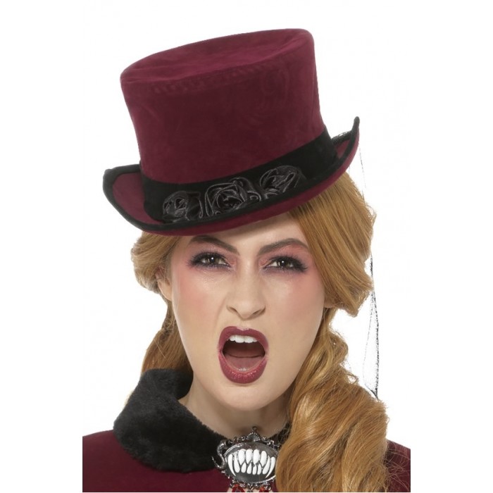 Шапка Цилиндър лукс с воал, викториански стил, бордо. Подходящ за Хелоуин, парти, карнавал и всякакви забавления.