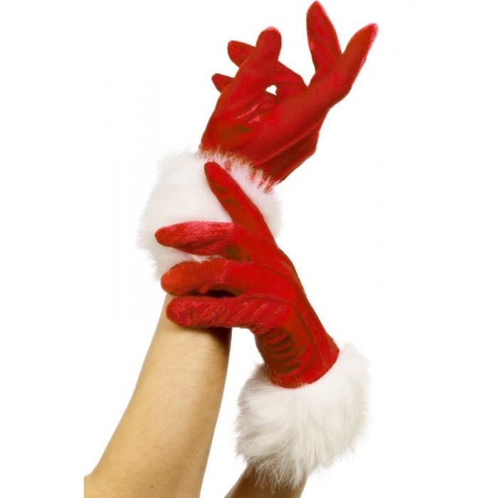 Ръкавици дамски, къси, червени с бял пух са подходящ аксесоар към вашия тоалет за Коледа, Нова Година и всякакви забавления.