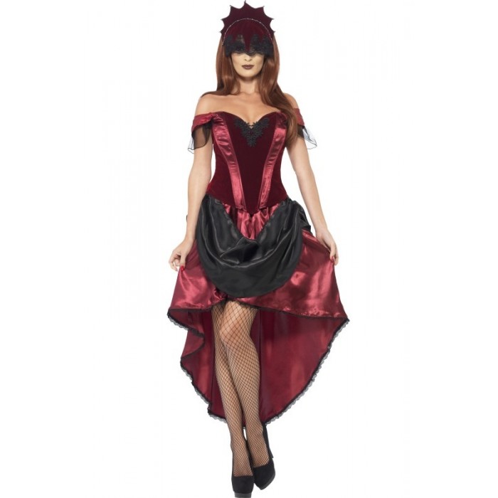 Дамски костюм Венецианска Изкусителка се състои от рокля и аксесоар за глава, изработени от плат. Подходящ за Хелоуин, парти, карнавал, училищни празненства и забави. Предлага се в размери S и M.