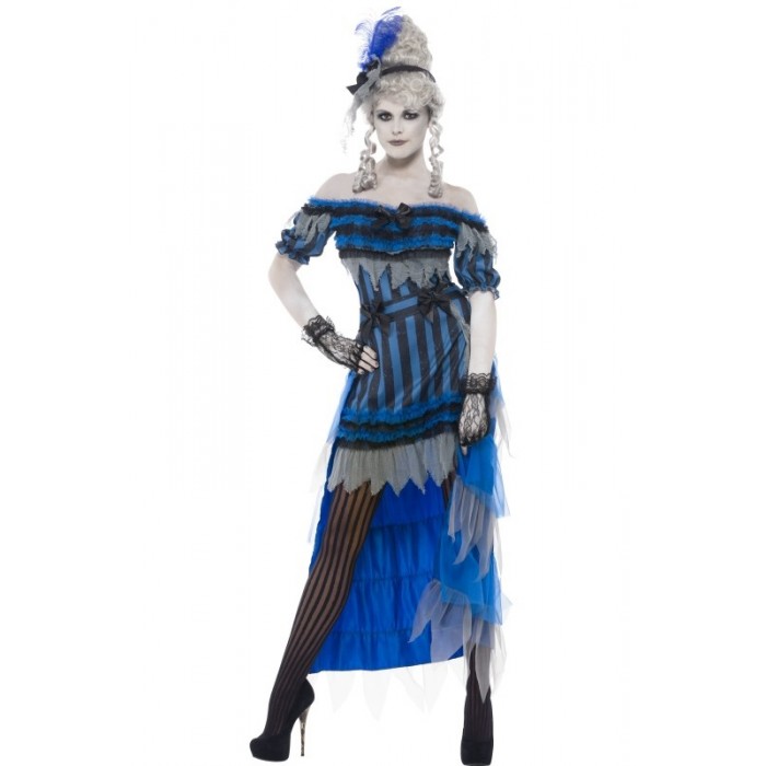 Дамски костюм Призрачното Момиче От Пивницата се състои от къса рокля със силиконови презрамки, които могат да се разкачат; задна част на дълга пола, която се поставя с колан и диадема за глава с перо, изработени от плат. Подходящ за Хелоуин, парти, карнавал, училищни празненства и забави. Предлага се в размер L.