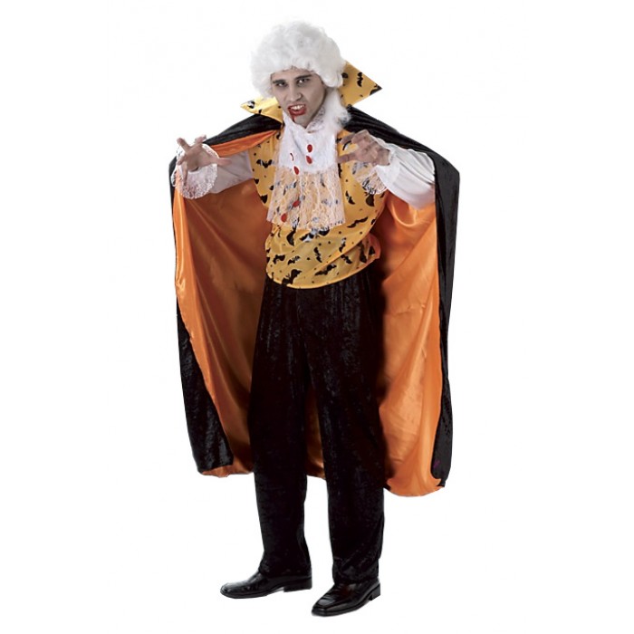 Мъжки костюм Дракула, черно с оранжево се състои от риза, панталон и наметало. Подходящ за Хелоуин, парти, карнавал, училищни празненства и забави. Предлага се в размер 52.