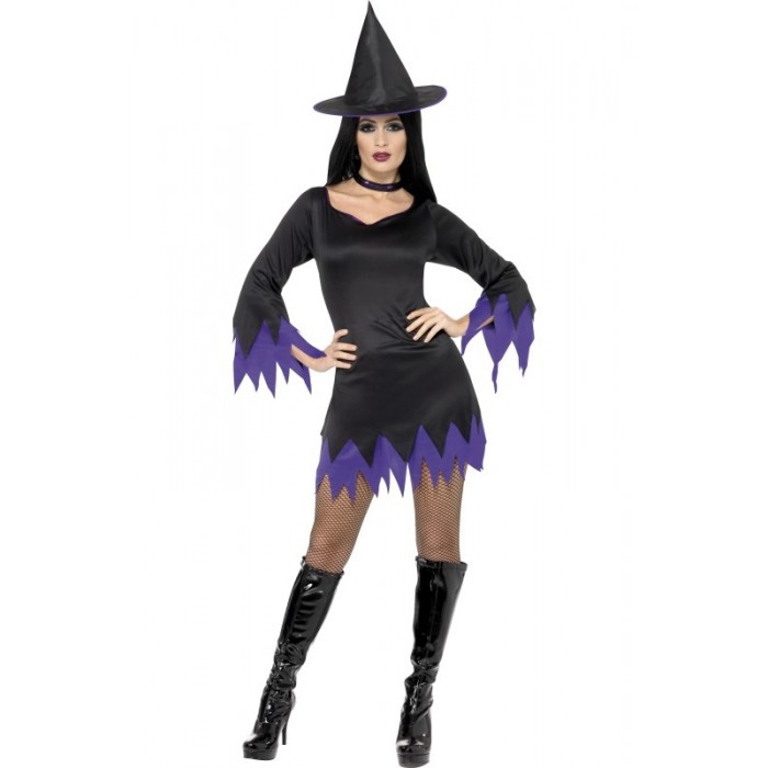 Дамски костюм Вещица в черно и лилаво се състои от рокля, шапка и лента за врата, изработени от плат. Подходящ за Хелоуин, парти, карнавал, училищни празненства и забави. Предлага се в размери S, M и L.