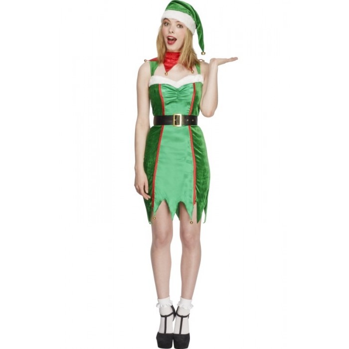 Дамски костюм Елф със звънчета, коледен - луксозен, състои се от рокля с яка, колан и шапка, изработени от плюшен плат. Предлага се в размер S.