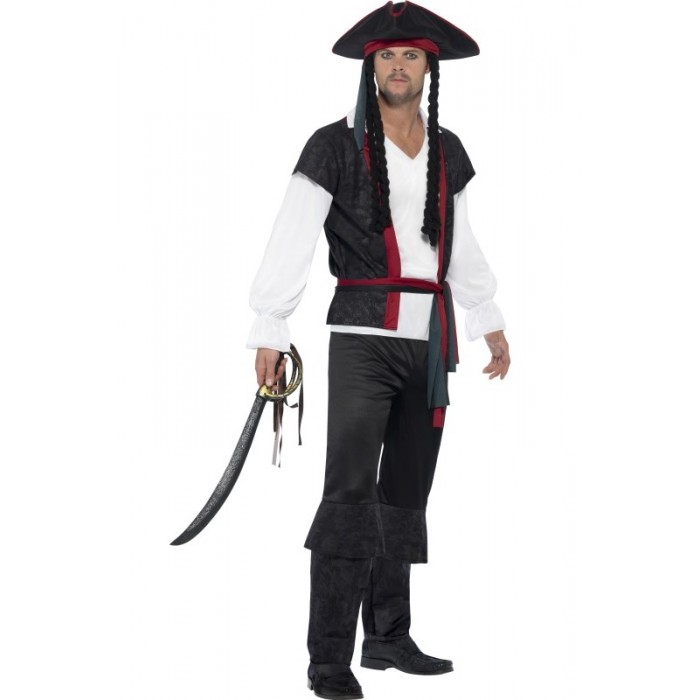 Мъжки костюм Пират се състои от блуза, колан, панталон и шапка с коса, изработени от плат. Подходящ за Хелоуин, парти, карнавал, училищни празненства и забави. Предлага се в размер M, L и XL.