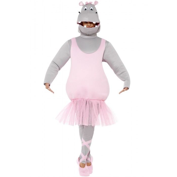 Забавен костюм Хипопотам Балерина се състои от блуза с поличка, панталон, шапка и балетни обувки, изработени от плат. Подходящ за Коледа, Нова Година, Хелоуин, парти, карнавал, училищни празненства и забави. Предлага се в универсален размер, подходящ за мъже и жени.