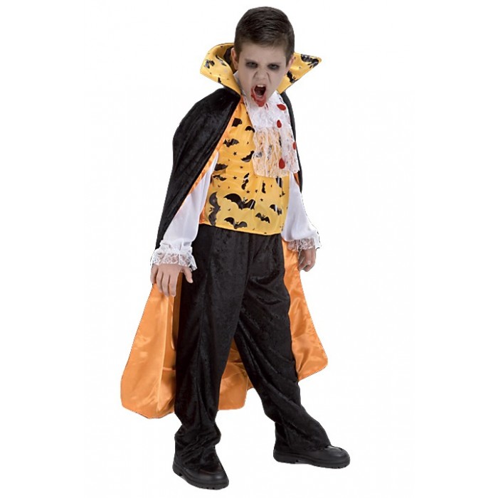 Детски костюм костюм Дракула, черно с оранжево се състои от риза с елек, панталон и наметало. Предназначен е за момчета на 10 години. Подходящ за Хелоуин, парти, карнавал, училищни празненства и забави.
