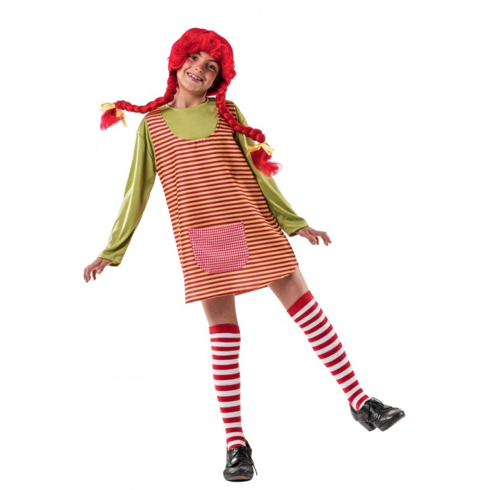 Детски костюм за момичета Пипи се състои от рокля, блуза с дълъг ръкав и чорапи. Предлага се в три размера: за 3-4, 5-7 и 8-10 години. Подходящ за Хелоуин, парти, карнавал, училищни празненства и забави.
