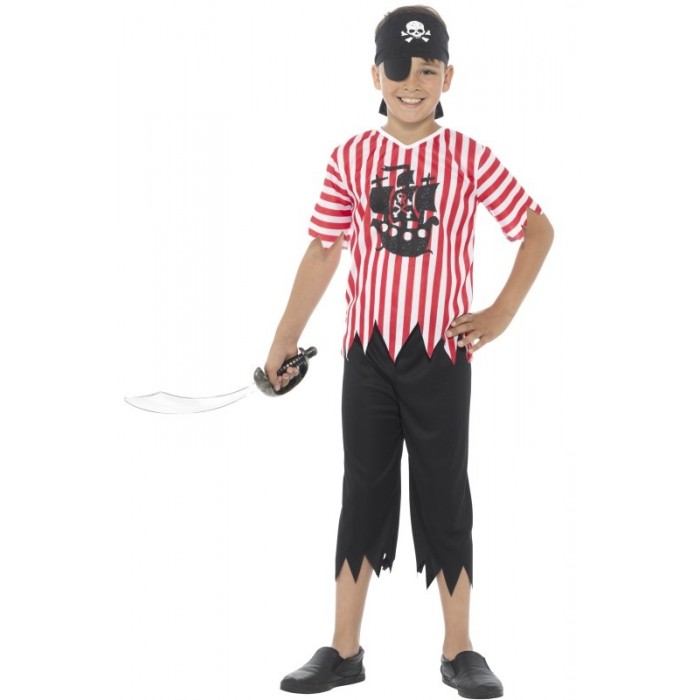 Детски костюм Веселия Пират се състои от блуза, панталон, лента за глава и превръзка за око. Изработен е от плат. Предлага в размери S, M и L. Подходящ за Хелоуин, парти, карнавал, училищни празненства и забави.