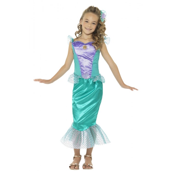 Детски костюм Русалка се състои от рокля и аксесоар за коса, изработени от плат. Предлага се в размер S, M, L и T (12+ години). Подходящ за парти, карнавал, училищни празненства и забави.