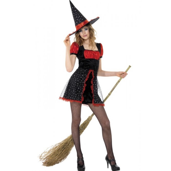 Тийн костюм черно-червена Звездна Вещица се състои от рокля и шапка, изработени от плат. Подходящ за Хелоуин, парти, карнавал, училищни празненства и забави. Предлага се в размер за 12+ години. Ханш - 70 см