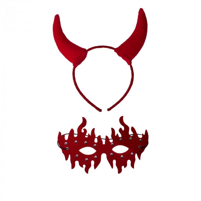 Комплект Дявол се състои от домино и рога, които са изработени от плат. Подходящи са за Хелоуин, маскарад, училищни празненства, парти, бал с маски и забави.