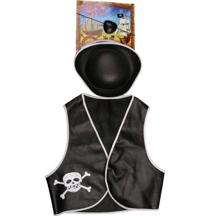 Детски комплект Пират включва: шапка, елече, превръзка за око и обеца. За деца от 4 до 10 годишна възраст. Подходящ за Хелоуин, парти, карнавал, училищни празненства и забави.