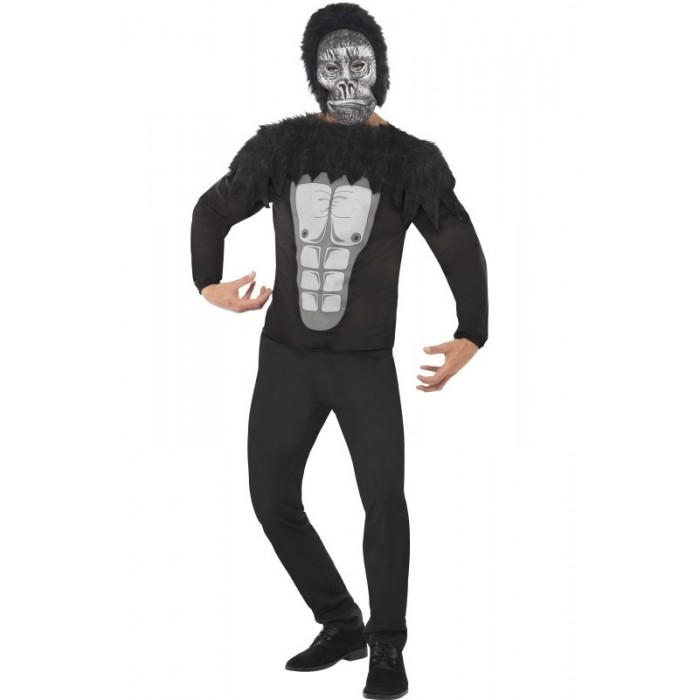 Комплект Горила се състои от маска и блуза, изработени от плат. Подходящ за Хелоуин, парти, карнавал, училищни празненства и забави. Предлага се в размер M и L.