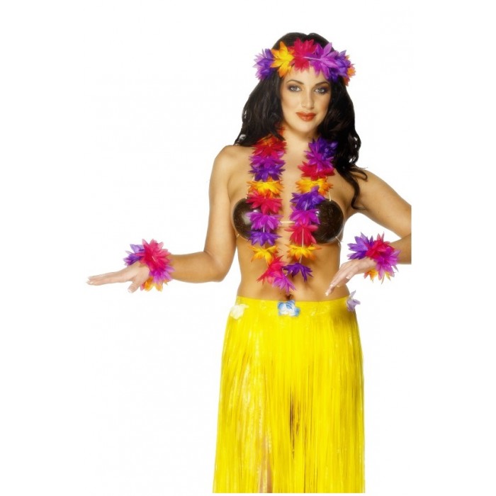 Хавайски комплект, многоцветен от 4 части - огърлица, лента за глава и две гривни. Подходящ за парти, карнавал, училищни празненства и всякакви забави.