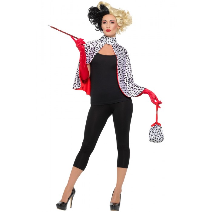 Комплект Круела Девил Лукс се състои от цигаре, наметало, чанта и ръкавици, изработени от плат. Подходящ за Хелоуин, парти, карнавал, училищни празненства и забави. Универсален размер.