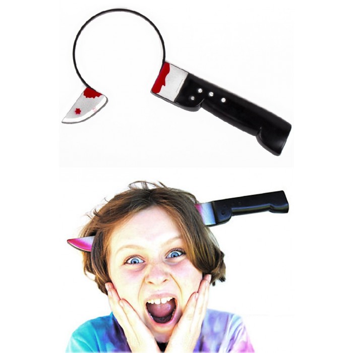 Нож през глава, пластмасов. Подходящ аксесоар за Хелоуин, парти, карнавал, училищни празненства и всякакви забавления.