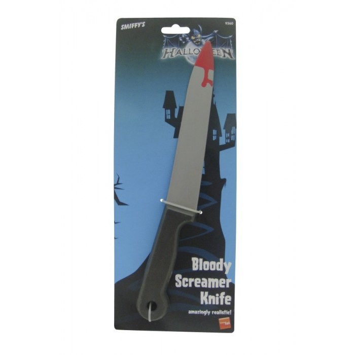 Пластмасова имитация на окървавен нож с дължина 33 см. Подходящ е за шеги, закачки, правене на номера и реквизит.