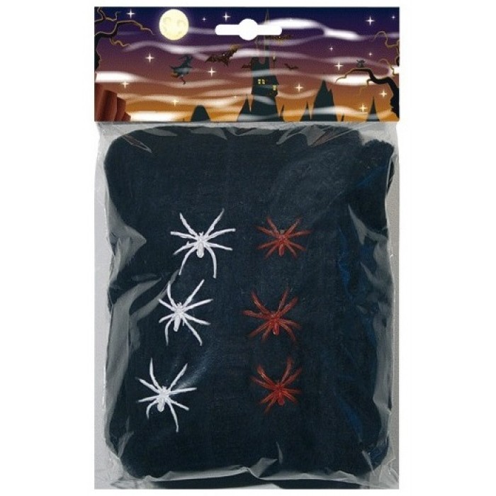 Паяжина с 6 паяка-100гр, черна е подходяща за декорация за Хелоуин.