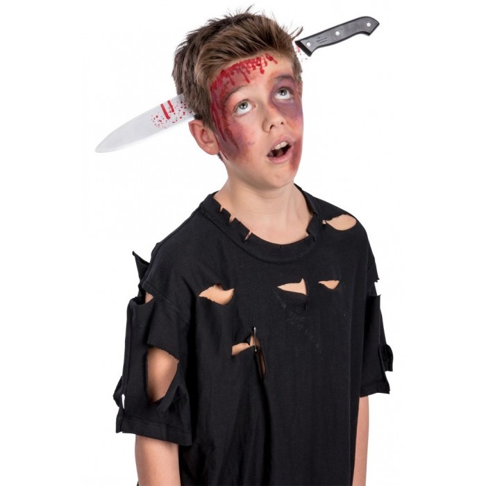Кървав нож през глава на диадема, пластмасов. Подходящ аксесоар за Хелоуин, парти, карнавал, училищни празненства и всякакви забавления.