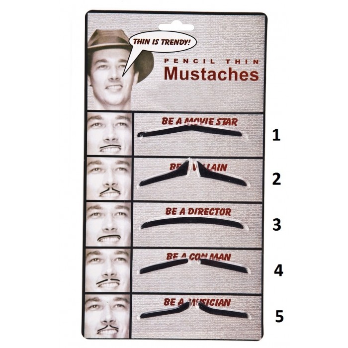 Мустаци черни, асорти, 5 модела със самозалепваща се лепенка. Цената е за един брой. Изберете модел от падащото меню. Подходящи за парти, карнавал и всякакви забавления.