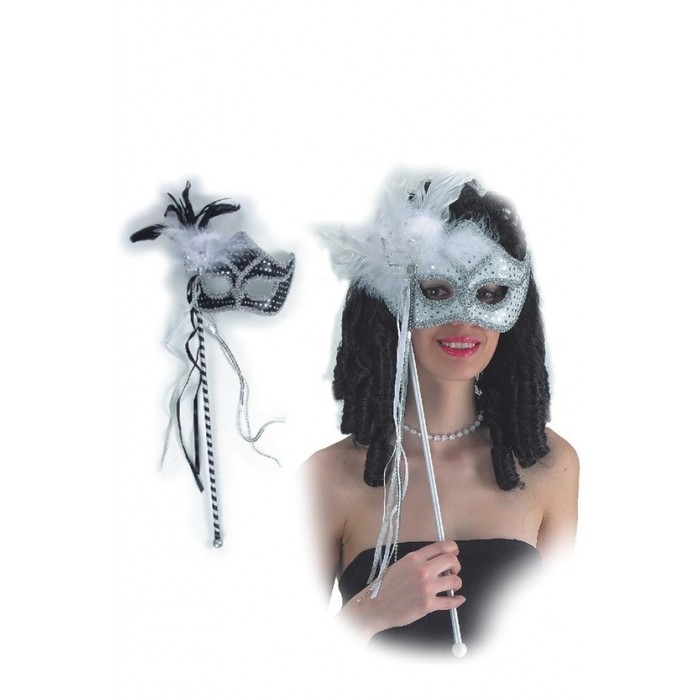 Домино с дръжка и пера, лукс е изработено от велур. Предлага се в два цвята - черно и бяло. Подходящо е за Хелоуин, маскарад, училищни празненства, парти, бал с маски и забави.