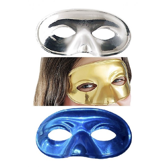 Домино обло металик е изработено от пвц. Предлага се в 3 цвята - златно, сребърно и синьо. Подходящо е за Хелоуин, маскарад, училищни празненства, парти, бал с маски и забави.