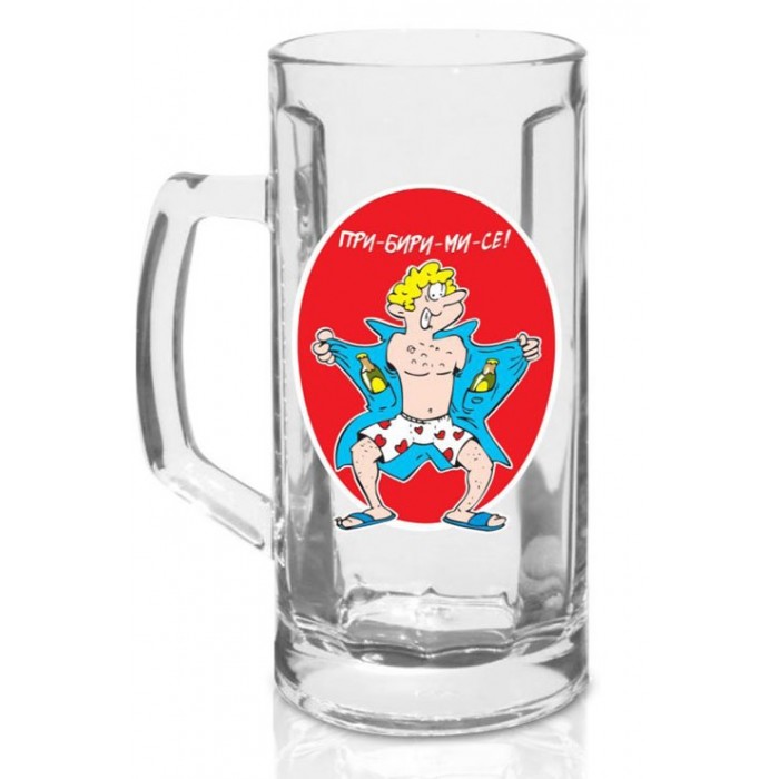 Стъклена халба за бира "При-бири-ми-се!" със забавна цветна картинка и закачлив текст, който би помогнал допълнително за повишаване на настроението на купона. Забавен подарък за любителите на бира и всякакви други поводи.