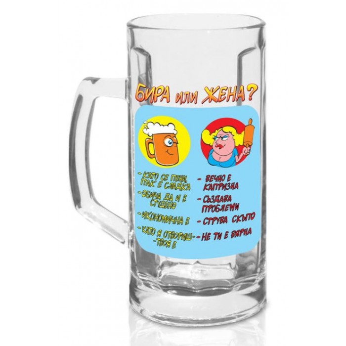 Стъклена халба за бира "Бира или жена?" със забавна цветна картинка и закачлив текст, който би помогнал допълнително за повишаване на настроението на купона. Забавен подарък за любителите на бира и всякакви други поводи.