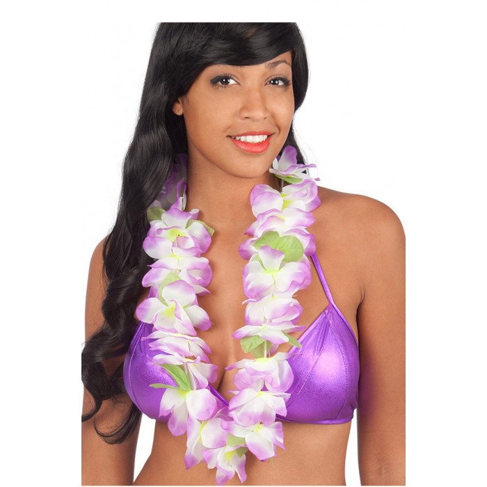 Хавайска огърлица от цветя лилаво-бяла. Подходящ аксесоар за парти, карнавал, рожден ден, училищни празненства, балове и всякакви забавления.