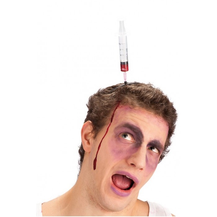 Спринцовка забита в главата, пластмасова. Кръвта не е включена в комплекта. Подходящ аксесоар за Хелоуин, парти, карнавал, училищни празненства и всякакви забавления.
