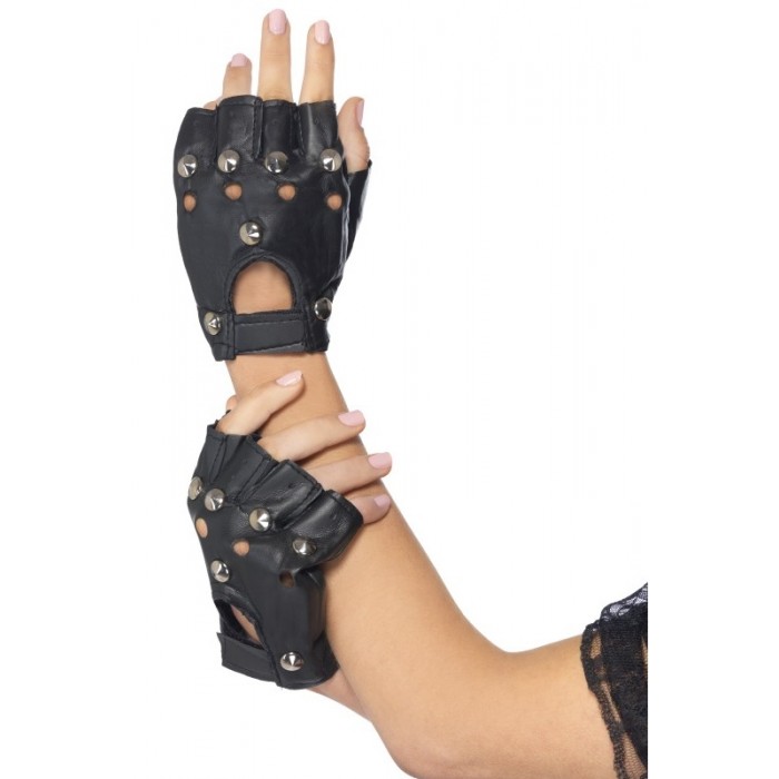 Ръкавици пънк, черни, къси, кожени с капси. Подходящ аксесоар за Хелоуин, парти, карнавал, училищни празненства и всякакви забавления.