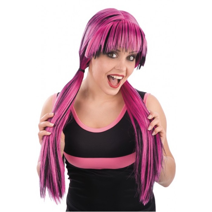 Перука Мис Дракулина, дълга с бретон и опашки, в розово и черно е изработена от изкуствен косъм. Подходяща е за Хелоуин, Коледа, Нова Година, маскарад, училищни празненства, парти, бал с маски и забави.