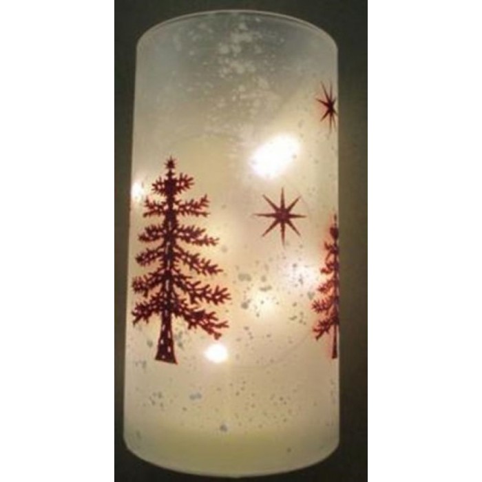 Стъклен свещник с 12 LED лампички, батерии, бял, мат, червени елени, 10х20 см