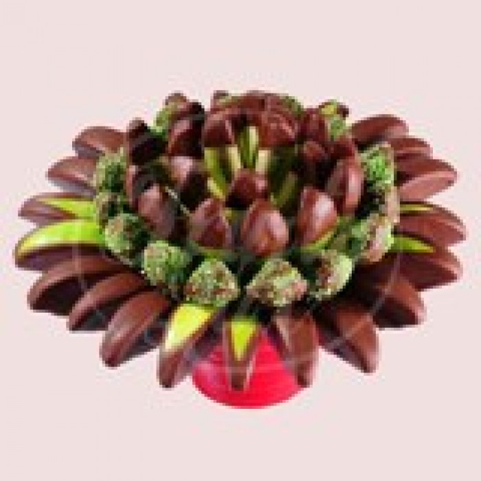 Апетитен букет от плодове - красива аранжировка от Киви, зелен лимон, ябълка, ядки, кафяв шоколад, кокос.