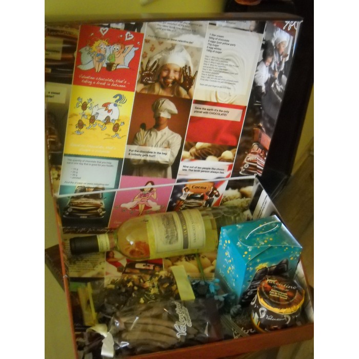 Оригинална подаръчна кутия пълна със селекция от вкусове и аромати ,подготвени от Шоколадова къща, с превъзходно ароматно бяло вино, комбинация от вкусове от летни сладки специалитети, подбрани от Шоколадова къща Valentino - за весели празненства и романтични пикници .