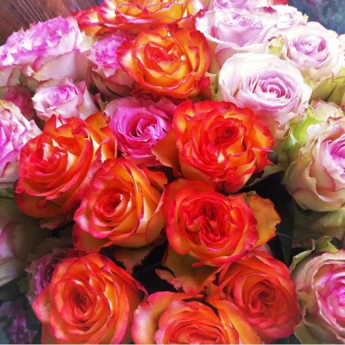 Разноцветна комбинация от пъстри рози, аранжирани в свеж букет.