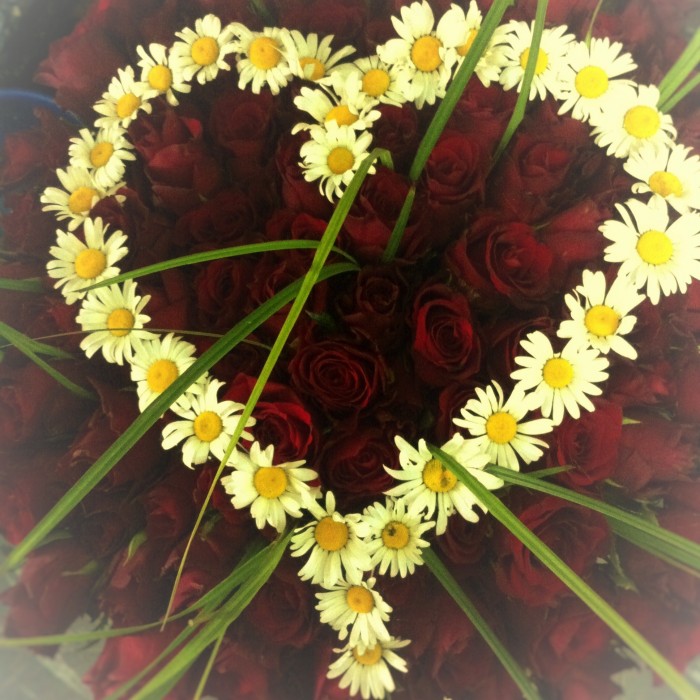 Букет от огнено-червени рози, подчертани от аранжимент на сърце.
