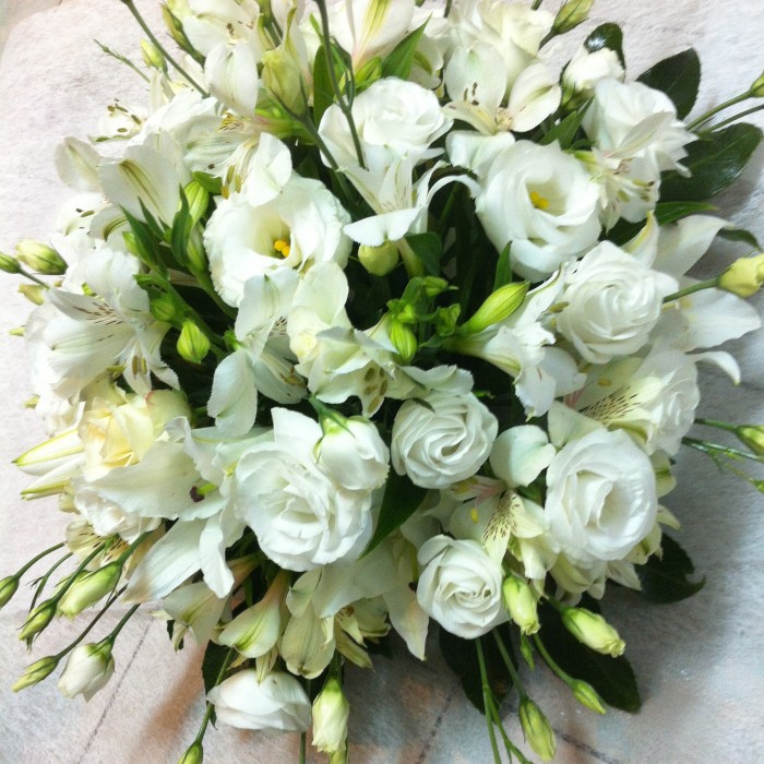 Свеж аранжимент в бяла гама от рози, еустома, подходящ за всеки повод.